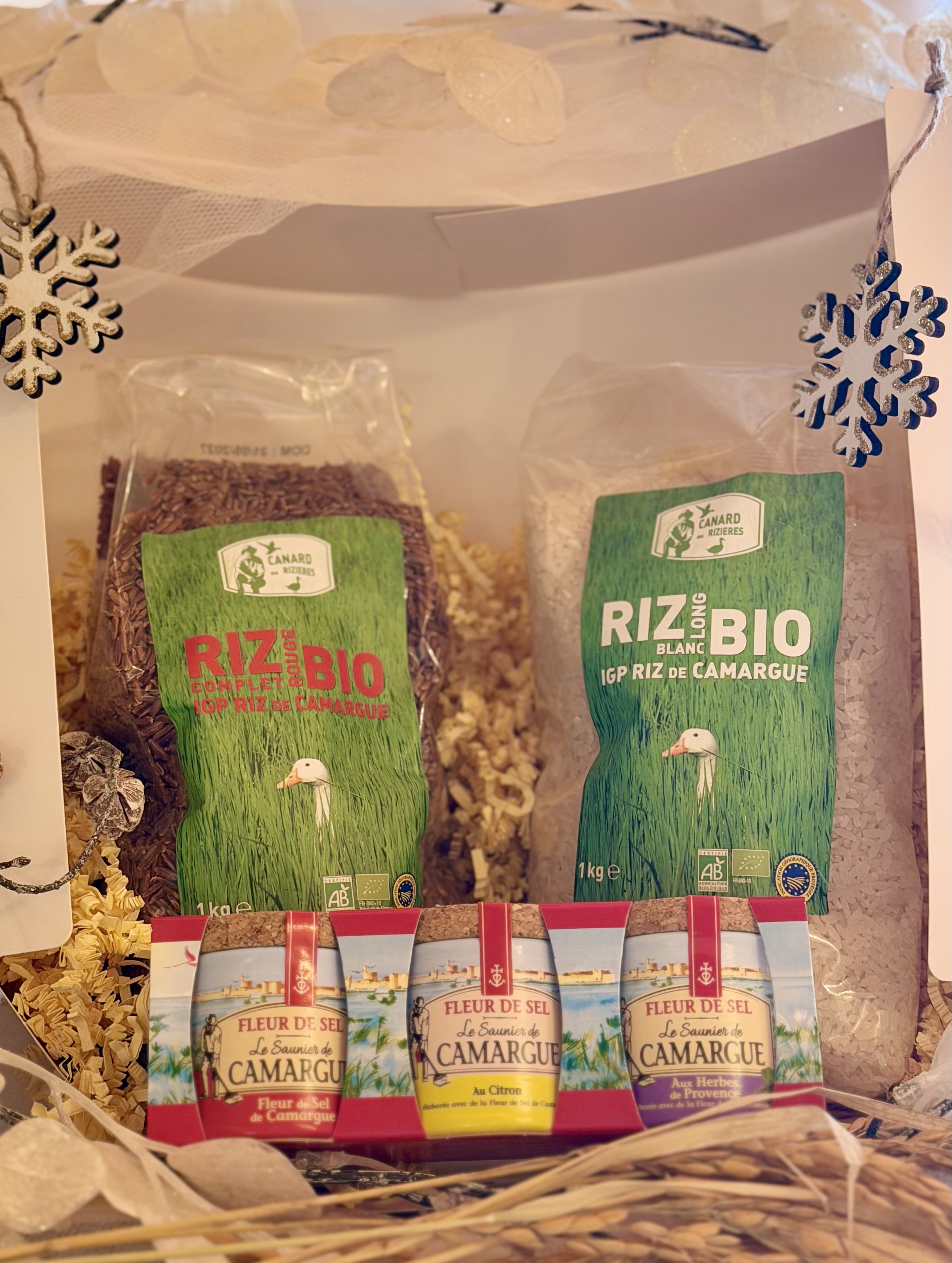 À l’approche des fêtes, nous vous proposons de découvrir notre coffret exclusif « Le Trio camarguais », parfaitement adapté pour un cadeau durant cette période festive. Ce coffret comprend trois minis boîtes rondes de fleur de sel de Camargue aux Herbes de Provence, Citron, Ail & Persil ainsi que 2 kg de riz de votre choix. Vous avez la possibilité de personnaliser son contenu en le précisant dans les « Notes supplémentaires » lors du récapitulatif de votre commande.