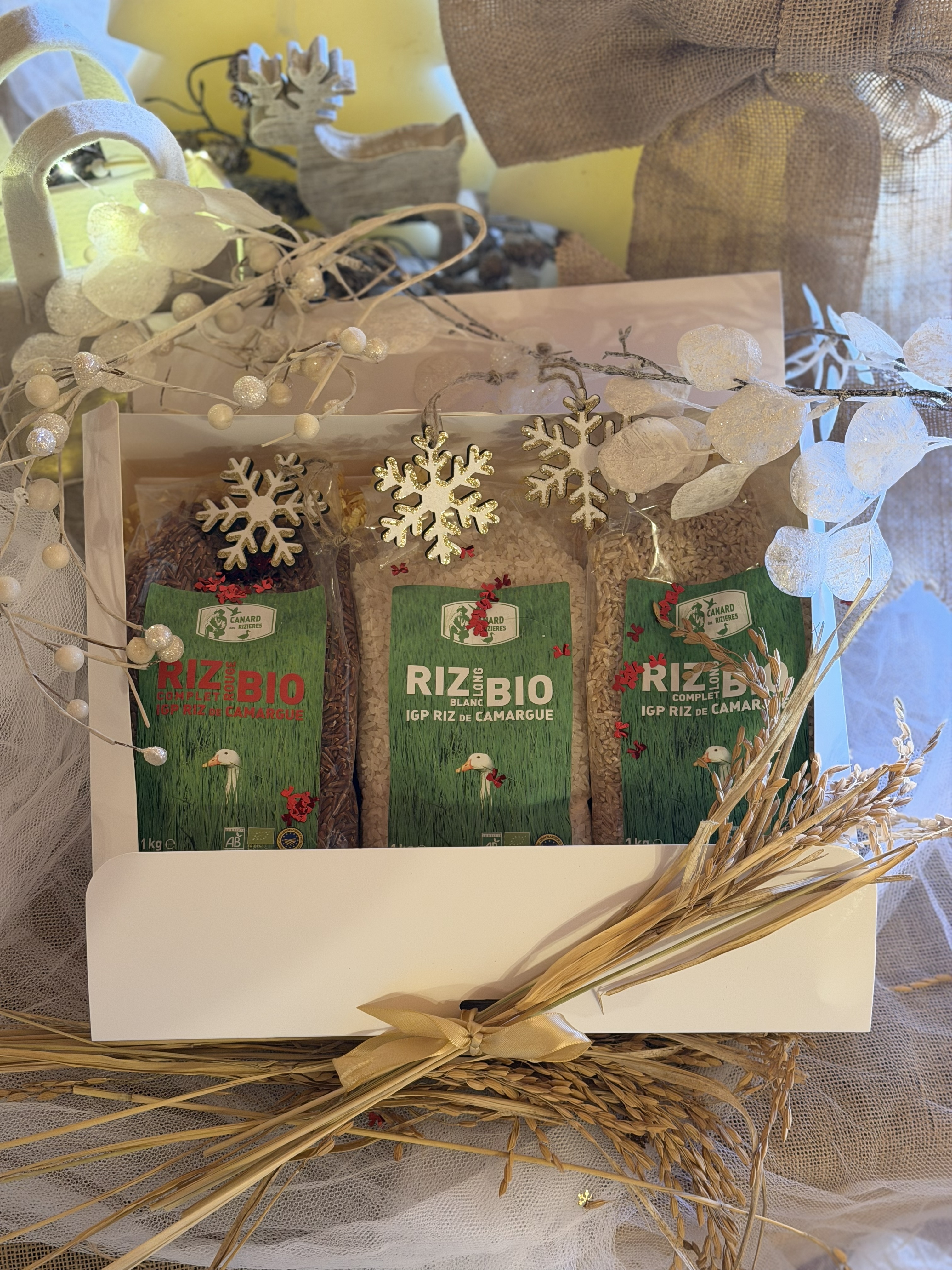 À l'approche des fêtes, nous vous invitons à découvrir notre coffret "Trio de riz essentiels", idéal pour offrir en cette période festive. Ce coffret comprend 3 kg de riz, incluant du riz blanc, rouge et complet.